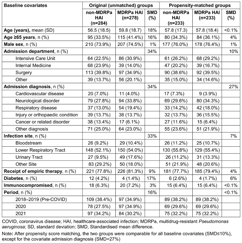 Table 1: Baseline characteristics of the original and propensity-matched groups of patients infected with P. aeruginosa by multidrug resistance status