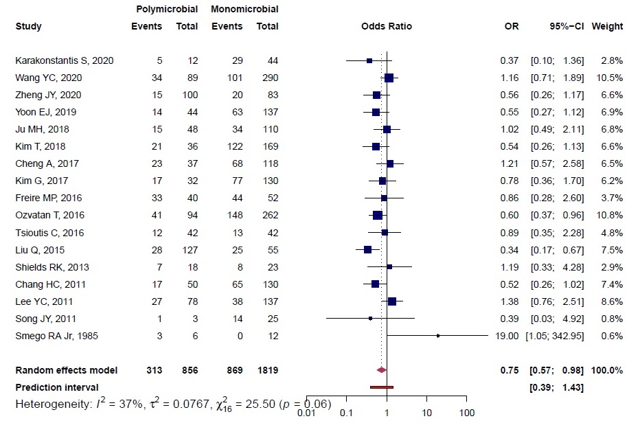 Based on 80 studies (9759 infections) from 23 countries, the pooled proportion of polymicrobial infection was 27% (95% CI 22-31%) and was similarly high for bloodstream and pulmonary infections. Polymicrobial infection was variably and insufficiently defined in most (95%) studies. Considerable heterogeneity (I2 = 95%) was observed that persisted in subgroup analyses and meta-regressions. Based on 17 studies (2675 infections), polymicrobial infection was associated with lower 28-day mortality (OR = 0.75, 95% CI 0.58-0.98, I2 = 36%). However, polymicrobial infection was not associated with in-hospital mortality (OR = 0.97, 95% CI 0.69-1.35, I2 = 0%) based on 14 studies (953 infections). The quality of evidence (GRADE) for the association of polymicrobial (vs monomicrobial) infection with mortality was low and at high risk of bias.